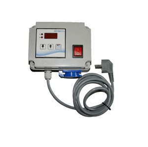 Affichage digital et programmation de temps de brumisation ARRET/PAUSE. Programmation digitale de 1 seconde à 99 minutes. .- Relais statique SSR 20a 2Kw pour pompe jusqu’à 13 litres - 2m de câble avec prise et une prise de branchement pour le câble de la pompe - 220V 50Hz.