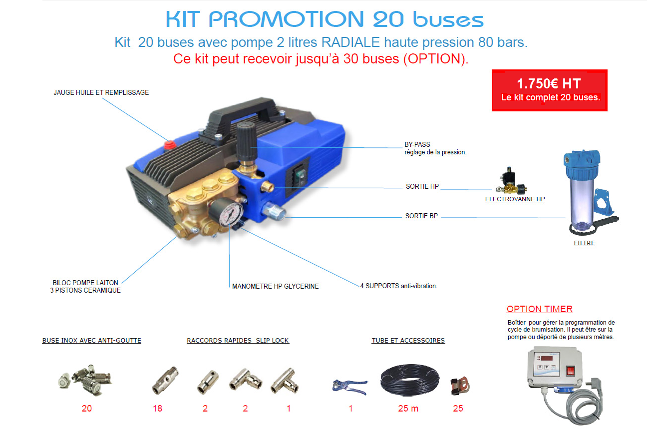 On peut augmenter le nombre de buses sur ce kit le faisant passer de 20 à 30 buses et aussi adapter des boîtiers de gestion de cycles ou de températures ou d’humidité.